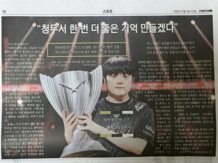 知名纸媒《首尔体育报》近日聚焦了Canyon夺冠的激动时刻。以下是其中的一些精彩内容: