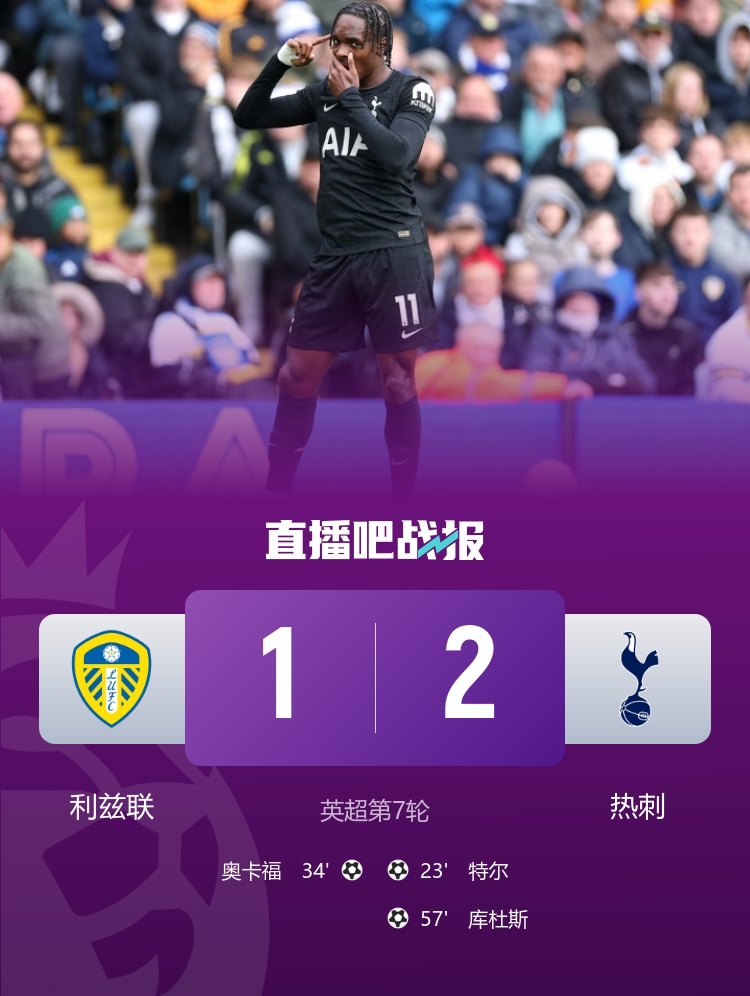 进入下半场,热刺在第57分钟再次取得进球,库杜斯展现了他的个人能力,巧妙内切至弧顶后发起一脚抽射,破门得分,为热刺奠定了2-1的领先。尽管利兹联试图反击,努力扳平比分,但最终未能改写局面。经过90分钟的激烈较量,热刺以2-1战胜利兹联,取得了近三轮英超的首场胜利。