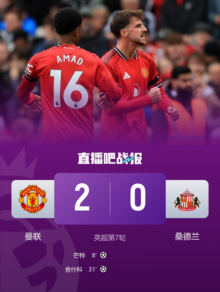 10月4日讯 北京时间10月4日22:00,在2025-26赛季英超联赛第7轮的较量中,曼联在老特拉福德球场迎战桑德兰,拉门斯迎来了他的首场亮相。比赛的上半场,曼联表现出色,姆伯莫为芒特助攻,后者在禁区内以一脚凌空抽射首开记录。接着,B费的射门击中门框,阿玛德的头球补射偏出,但舍什科在混战中找到了机会,成功将球送入网中,助曼联以2-0领先桑德兰结束上半场。