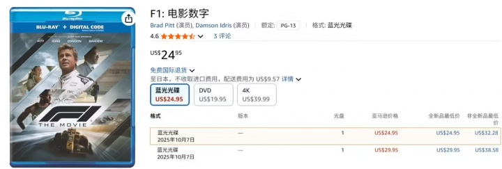 10月8日讯,科技媒体9to5Mac昨天发布了一篇重磅博文,称苹果公司投下巨额资金的原创电影《F1:狂飙飞车》,在影院大获成功后,终于开始售卖蓝光、4K蓝光,以及DVD实体光盘。真是让人怀疑,苹果的下一个目标是否是将电影制片与水果销售相结合。