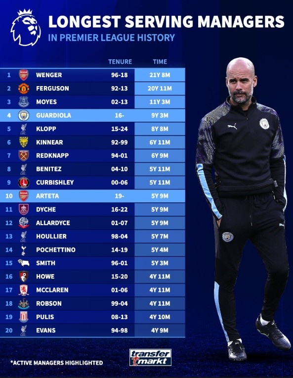 紧随其后的是莫耶斯,他在埃弗顿的执教时间达到了11年零3个月,稳定性和耐心在如今快节奏的足球环境中显得尤为珍贵。而目前在榜单上位居第四的瓜迪奥拉,已经在曼城执教了9年零3个月,他凭借出色的战术和对球队的改造,使曼城成为当今足坛的强队。