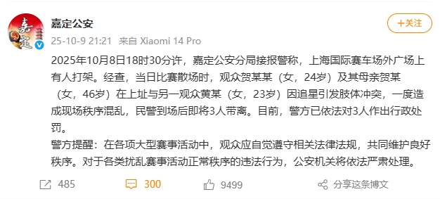 10月10日讯 昨天,上海嘉定公安分局发布消息,提到在10月8日的上海国际赛车场外发生了因追星引起的肢体冲突事件,警方对此进行了行政处理。