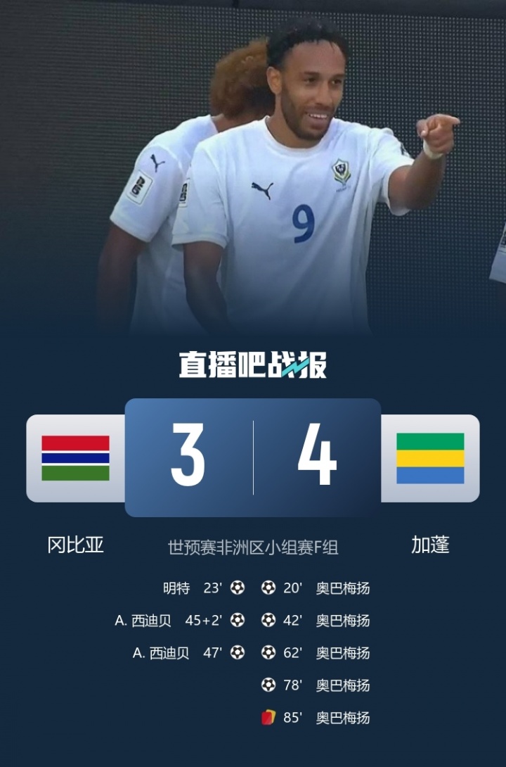 在10月10日举行的世预赛非洲区F组第9轮中,加蓬以4-3的惊险比分战胜了冈比亚,36岁的前锋奥巴梅扬表现神勇,不仅打入四球,更是凭借个人的卓越表现为加蓬赢得了这一关键胜利。
