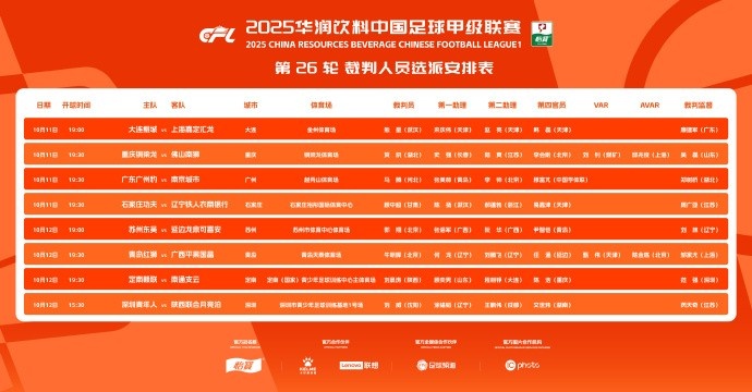 10月11日,2025华润饮料中甲联赛第26轮的裁判选派结果新鲜出炉。本轮比赛中,有两场对决将启用VAR裁判,这是提升比赛公正性的亮点之一。这两场比赛分别是重庆铜梁龙对阵佛山南狮,以及青岛红狮对抗广西平果。让我们看看本轮的具体裁判安排。