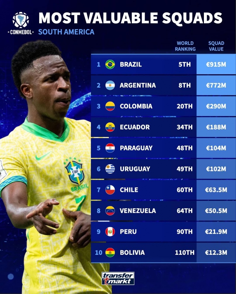 智利和委内瑞拉分别以6350万欧元和5050万欧元的身价位列第七和第八,显示出他们在改进和发展的努力。秘鲁和玻利维亚在这份榜单中也展现了自己的身价,分别为2190万欧元和1230万欧元,尽管身价不算高,但他们在区域内的努力同样值得赞赏。