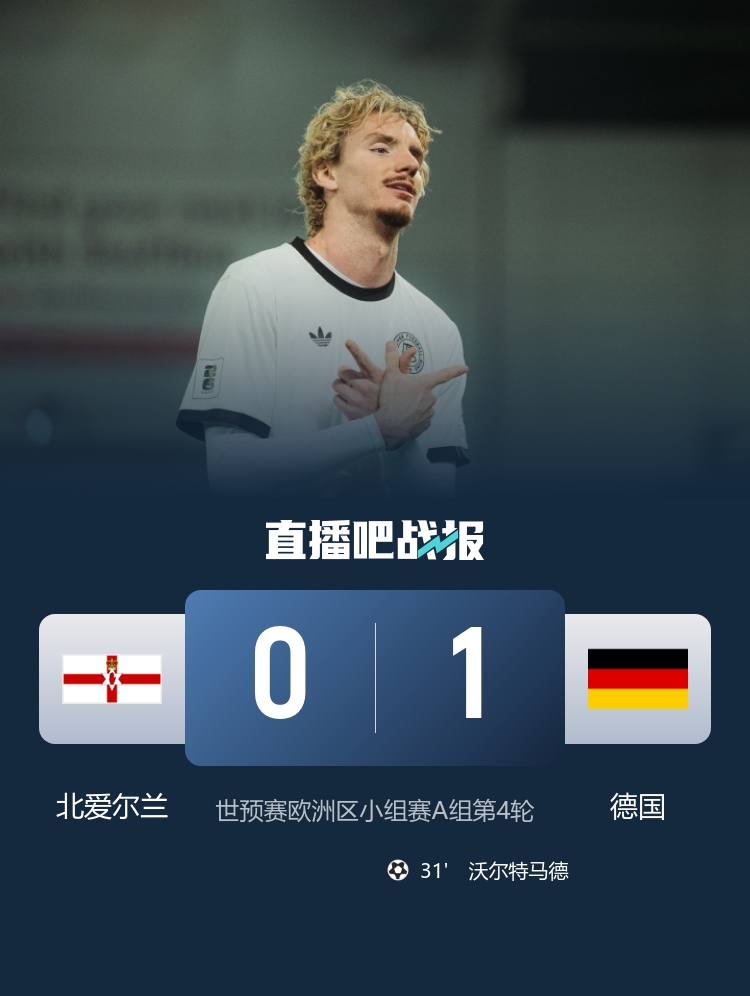 北京时间10月14日02:45,世预赛欧洲区A组第四轮中,德国队在温莎公园球场迎战北爱尔兰。上半场,德国队的巴拉德进球被判无效,随后劳姆助攻沃尔特马德打进头球,帮助德国队取得领先。下半场,阿德耶米错失了一次单刀机会,最终德国队以1-0战胜北爱尔兰,迎来三连胜。
